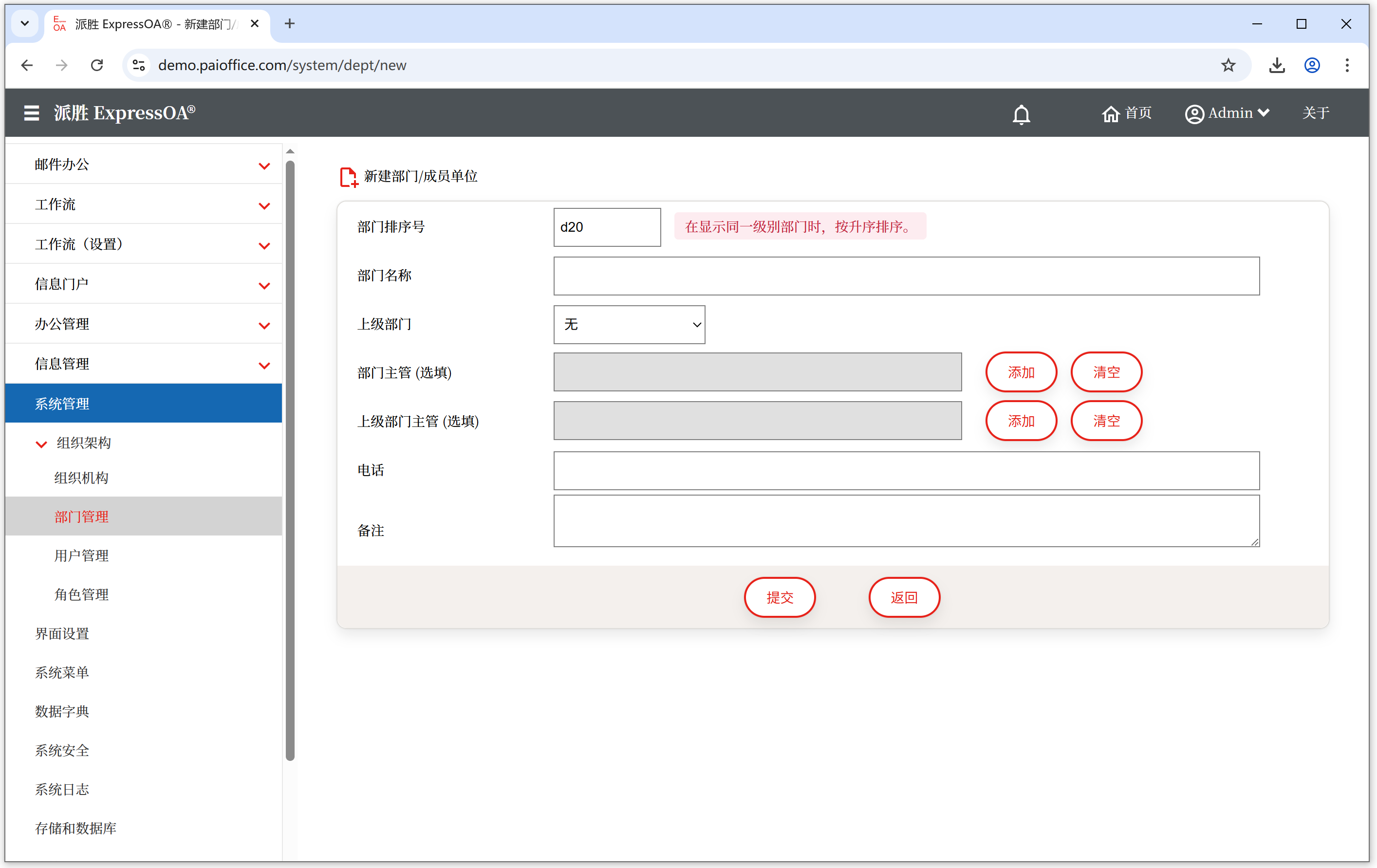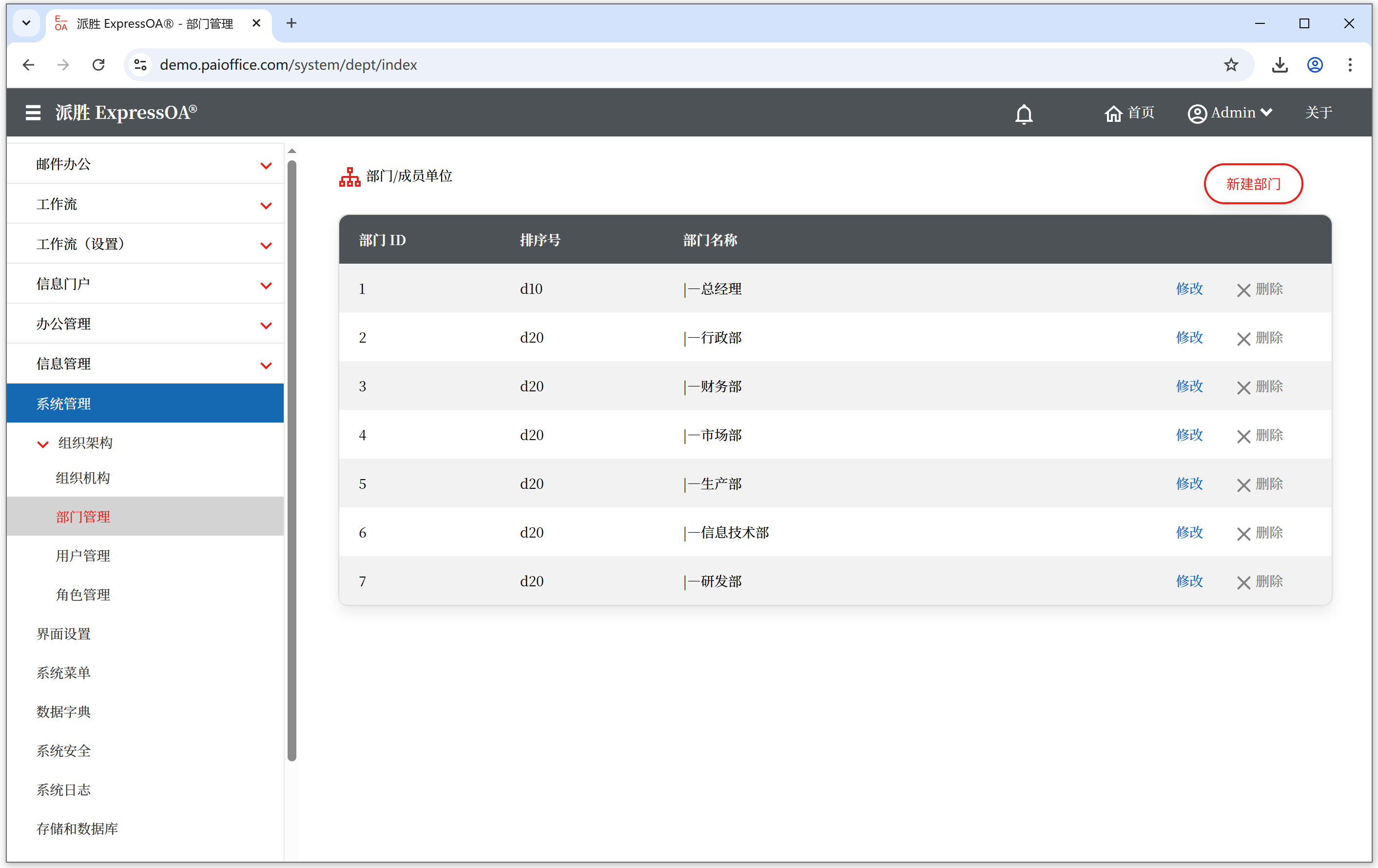 访问 ExpressOA 菜单【系统管理 → 部门管理】,创建、修改和删除部门。