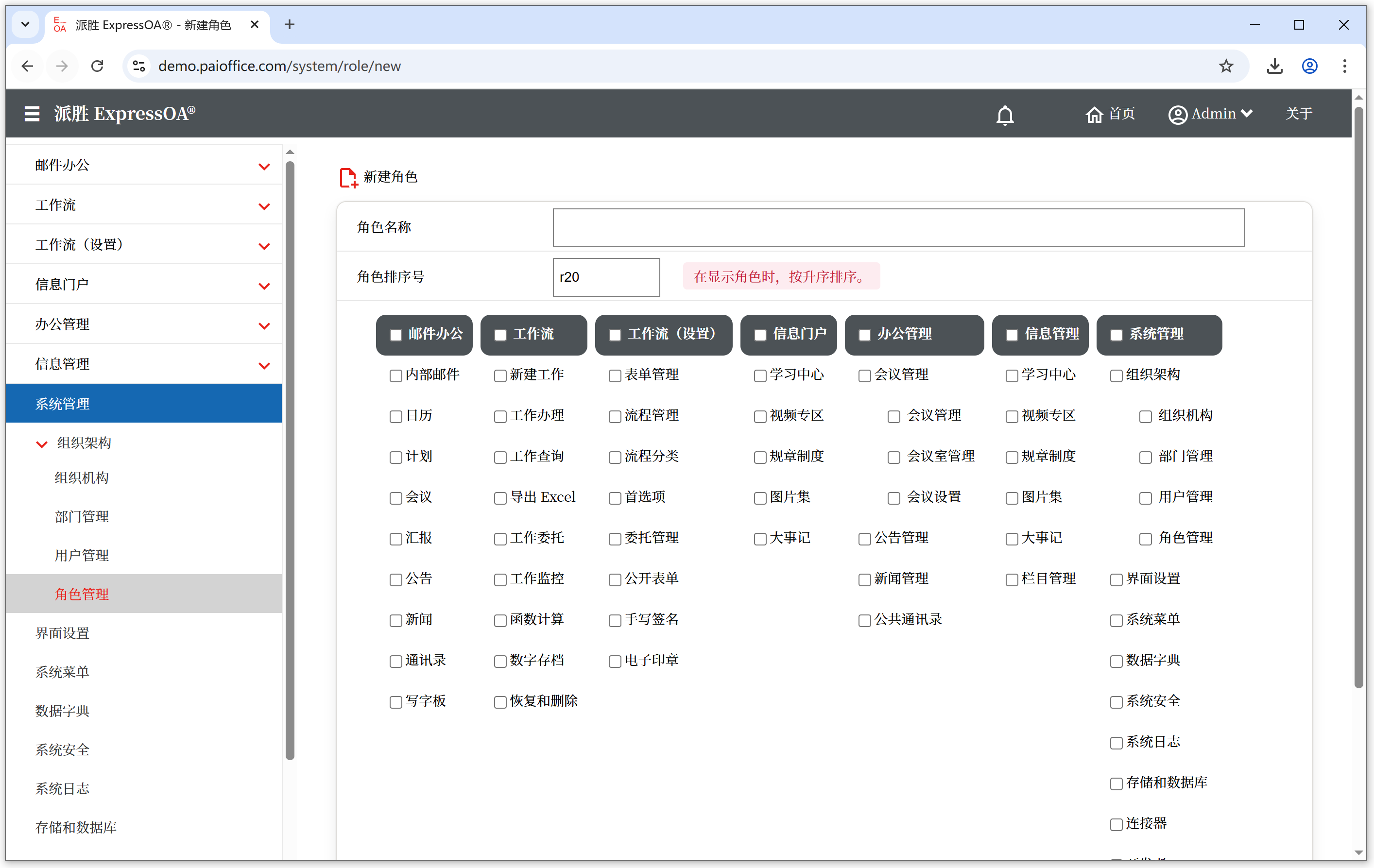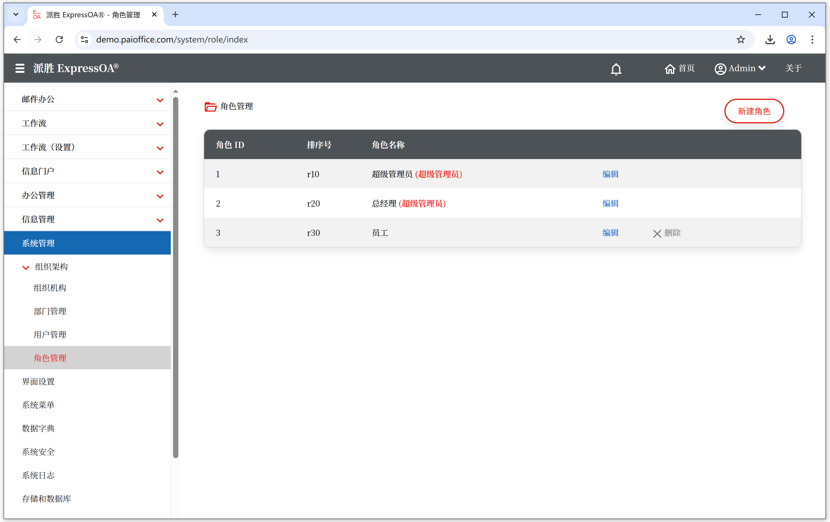 访问 ExpressOA 菜单【系统管理 → 角色管理】,创建、修改、删除角色。