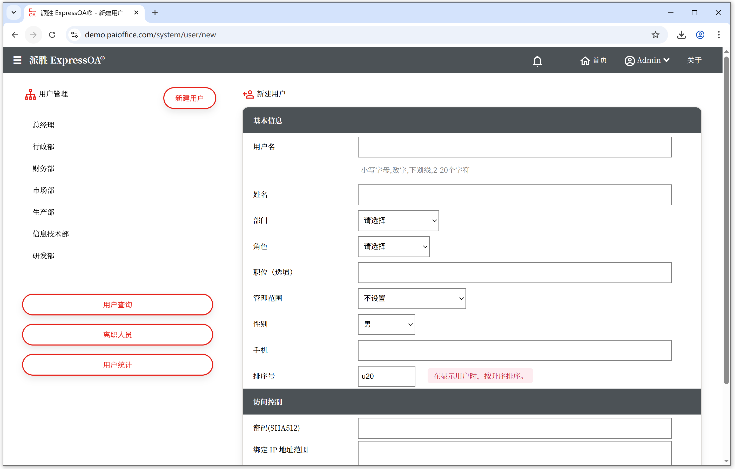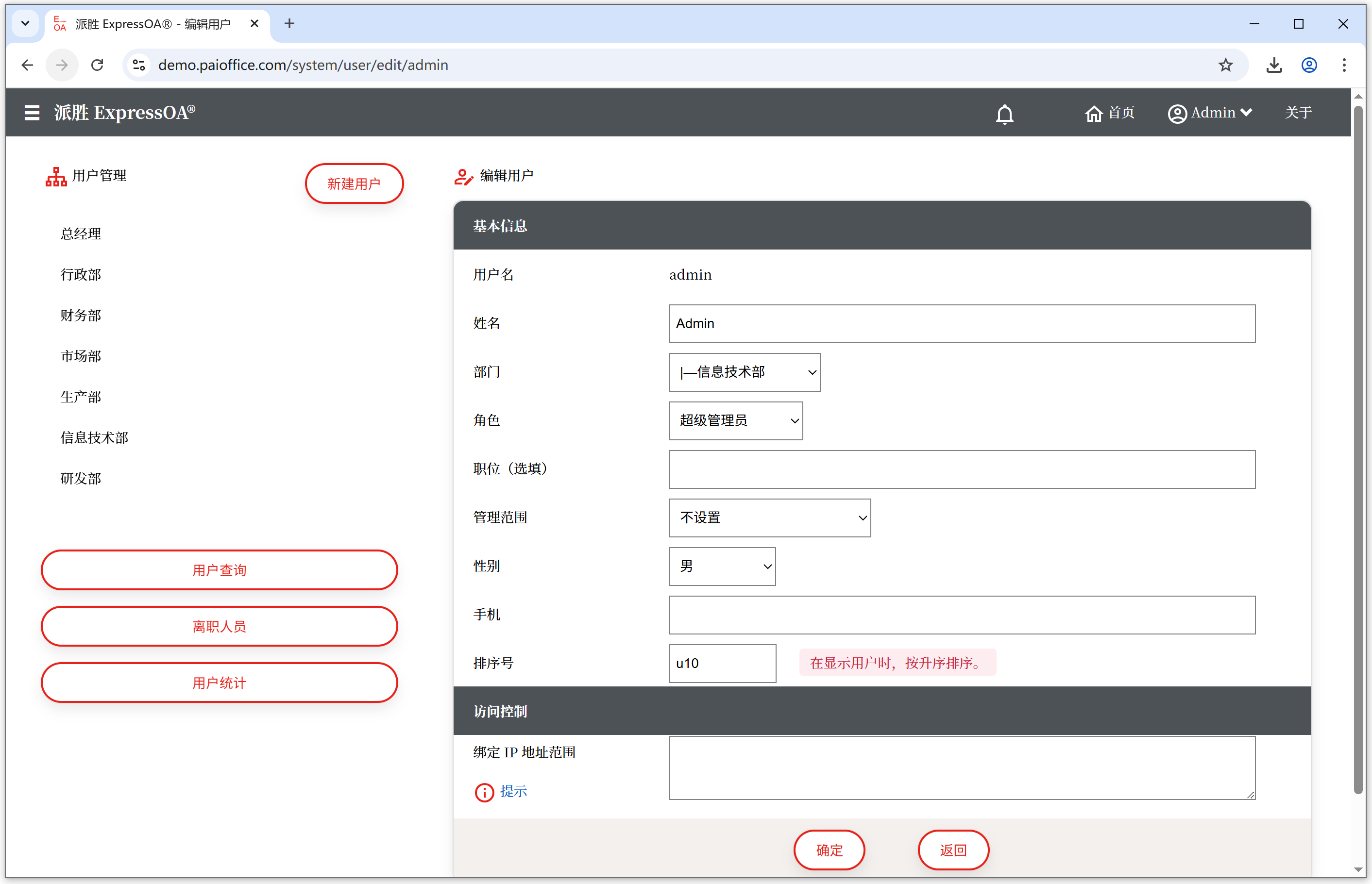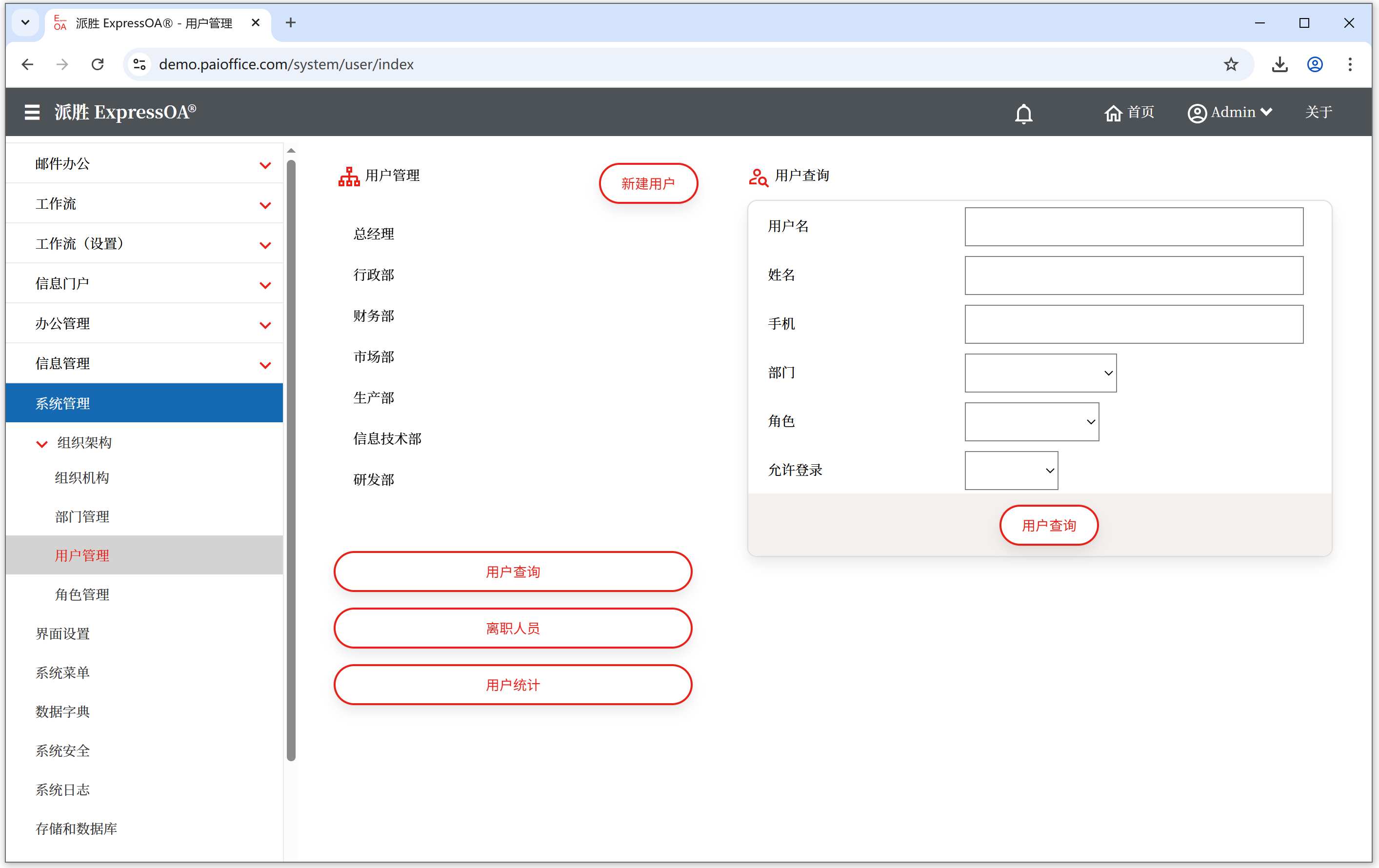 访问 ExpressOA 菜单【系统管理 → 用户管理】,创建、修改、删除用户。